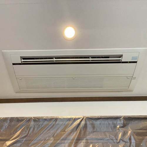 本日は東京都世田谷区の一戸建てにて行いましたダイキン製ハウジングエアコンの入替え工事をご紹介いたします。三菱重工製からダイキン製天井埋込カセット形シングルフローへの入替え工事です。開口工事を伴いました。
