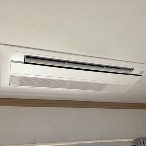 本日は東京都新宿区のテナントオフィスにて行いましたダイキン製業務用エアコンの入替え工事をご紹介いたします。今回は天井吊形エアコンの更新工事となります。新規室内機のサイズが既存より大きく、照明に干渉してしまうため照明の移動を行いました。