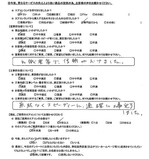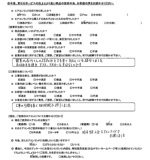 営業担当の評価:★5.0 見積りの時、他社ではしてくれなかった細かい説明を受け信頼出来ると思いました。今回隠蔽配管のマルチエアコンをシングルエアコンにする他社では断られた厳しい工事にも関わらず親切・丁寧に対応してくれた、村口様に感謝いたします。