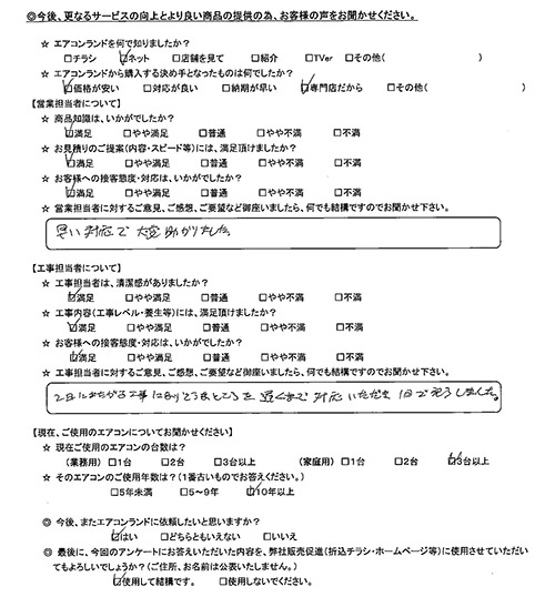 | 担当者へのコメント | 2日にまたがる工事になりそうなところを遅くまで対応いただき1日で完了しました。 |