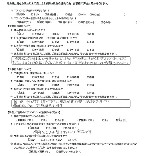 営業担当の評価:★4.3 適切な機種をご提案いただきました。 工事担当の評価:★3.6 テキパキと短時間で工事していただきました。