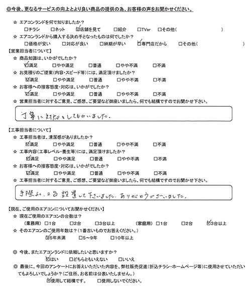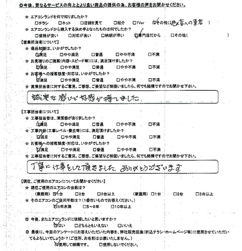 営業担当の評価:★5.0 家電量販店の店頭での店員(おそらくメーカー出向)の知識と対応(売る気)に失望して依頼させていただきましたが、さすが専門店だけあって、知識も豊富で、質問にも公平な意見で信頼できました。