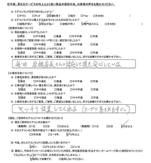 工事担当の評価:★5.0 エアコンランドの存在を知るまでエアコンは家電量販店で購入していたが、施工業者の品質がまちまちで、なかにはひどい業者もあった。今回エアコンランドの工事の質を見て、能力の違いに驚いた。
