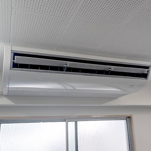 天吊形の取り付けです。お客様のご希望で既存スリーブを利用した施工を行いましたので、室内の配管露出部が多く配管も長くなりました。室内配管はスリムダクトで綺麗に加工しました。