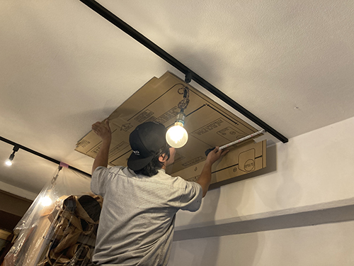 打ち合わせにて決定した設置場所を確認し、機器を吊り込むための準備をします。しっかりと計測しエアコン本体を吊り込みます。
