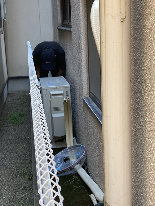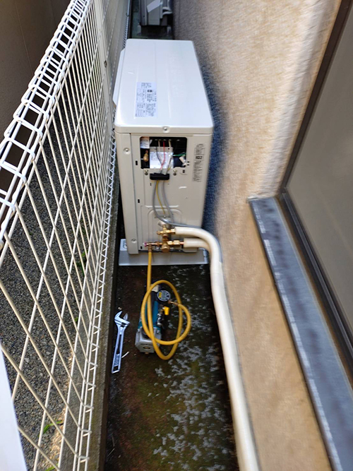 室内機側の配管接続完了です。室外機もお客様と打ち合わせした場所に設置します。合わせてブレーカーより電源増設工事も行っていきます。