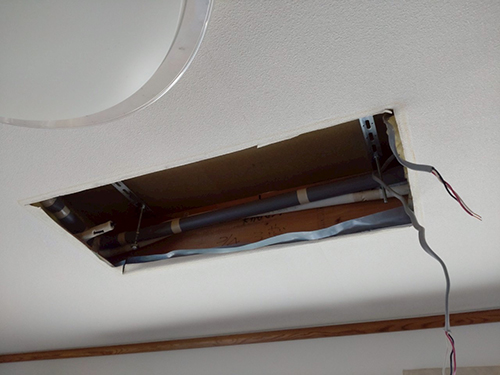 ポンプダウンをして本体を撤去しました。天井内に配管や配線が露出しており、支持具が一部確認できる状態です。新規機器への接続処理が必要になります。