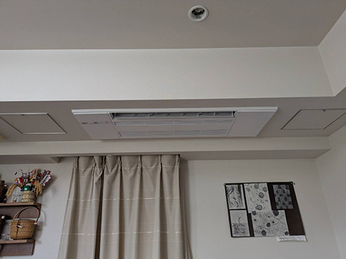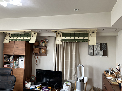 既存機器は天井埋め込み形3台マルチでしたが、リビングに隣同士で2台あったため1台はそのまま残し1台のみ入替えを行い、隣の部屋の1台を2台マルチに変更して入替えることになりました。リビングの1台は少し能力を上げて部屋全体をカバーします。
