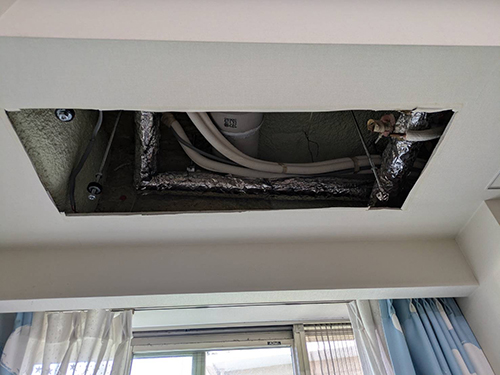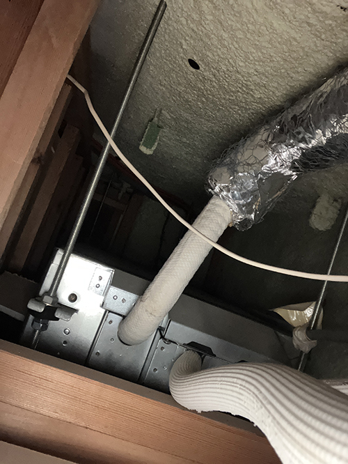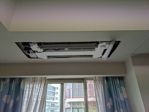 同じ三菱電機製後継機種での入替えのため、天井ふところ内の本体の寸法は同じです。埋め込まれる本体部分のサイズが同じため、天井の開口作業などせずに入替えられるというメリットがあります。今回については特に小部屋用(6畳用)のミニカセット形があったことも、同じメーカーでご提案する要因にもなりました。