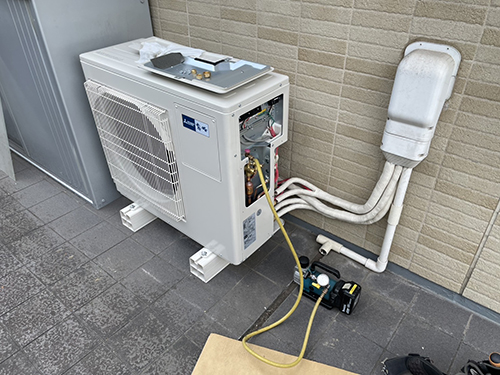 室内機・室外機も取り付けて真空ポンプで真空引き後、試運転行い完了です。作業時間は6時間程でした。