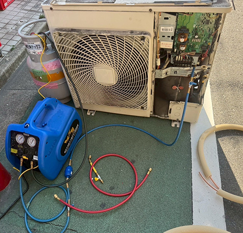 続いてガス回収作業です。フロン排出抑制法によりフロン類の回収は義務となっております。エアコンランドでは必ず行う作業となります。