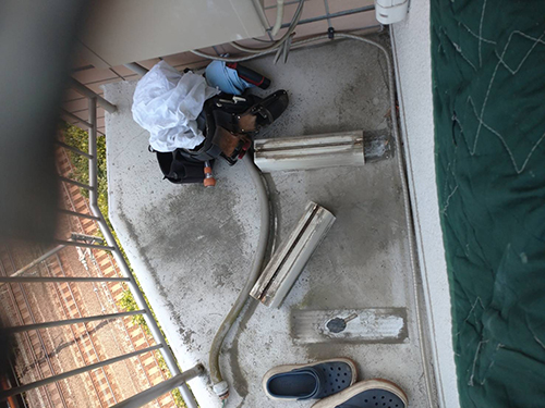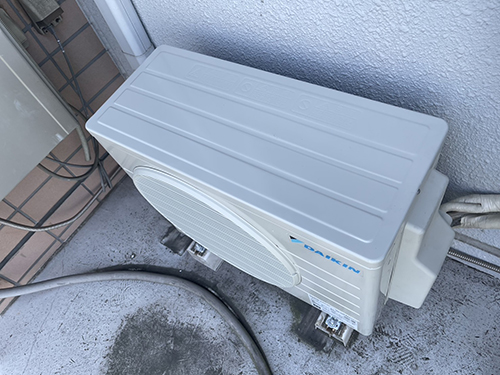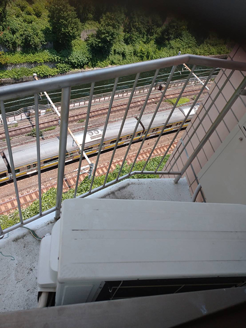 既存機器ダイキンから新機器ダイキンへ入替えます。壁掛形の室内機2台に対して室外機が1台のマルチエアコンです。室外機はベランダ置きとなっています。