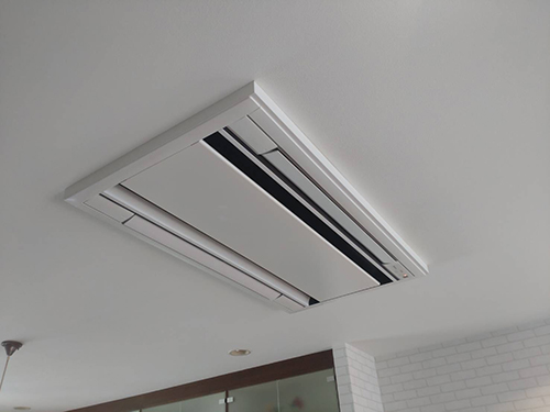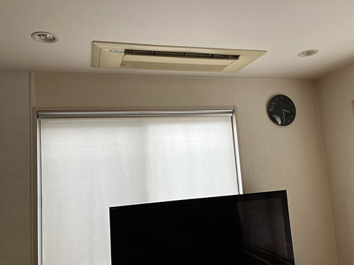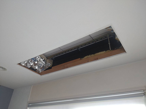 パッケージエアコンは天井ふところが浅くおさまりきらず、4cm程天井からはみ出た状況になっています。