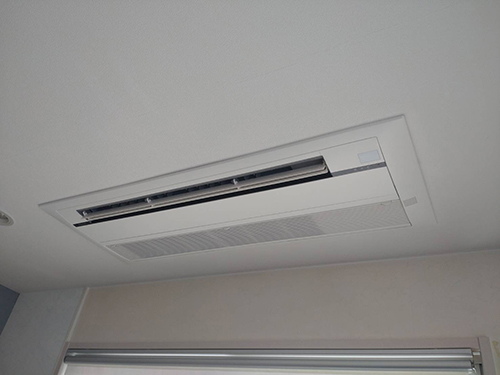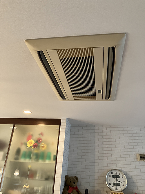 既設機を確認します。ハウジングエアコンの方は天井埋込カセット形シングルフローです。パッケージ(業務用)エアコンは吹き出し口が2方向ある天井埋込形です。