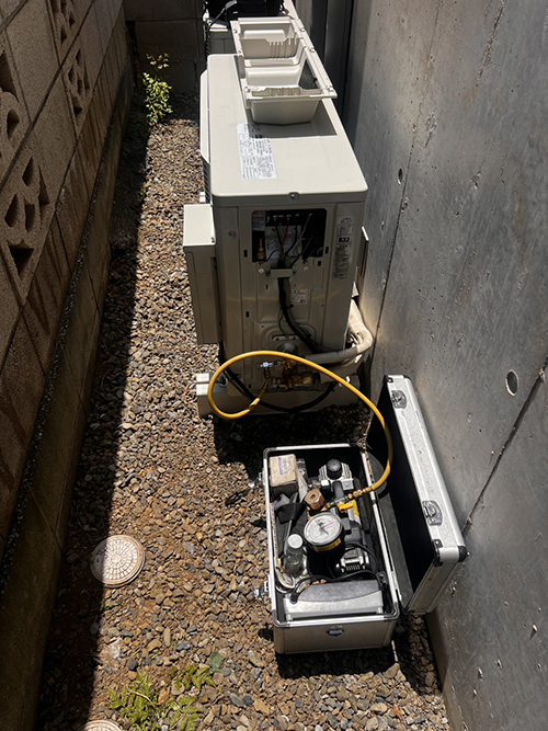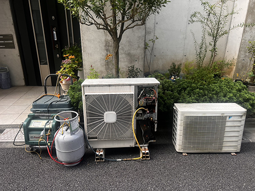 続いてガス回収作業です。フロン排出抑制法によりフロン類の回収は義務となっております。エアコンランドでは必ず行う作業となります。