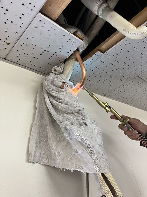 室内機の寸法が変わり、冷媒配管の長さを延長するため溶接して冷媒配管を延長いたします。新規室内機を接続するため再利用する配管をフレア加工し、配線の長さを調整して接続の準備をします。室内機の配管ドレン、吊り位置を調整して接続しました。