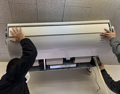 ポンプダウンをして既存室外機に冷媒ガスを戻し、既存室内、室外機を取り外し撤去しました。室内機を下す時は2人作業で行います。