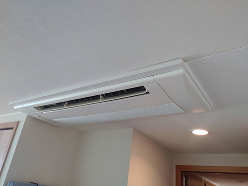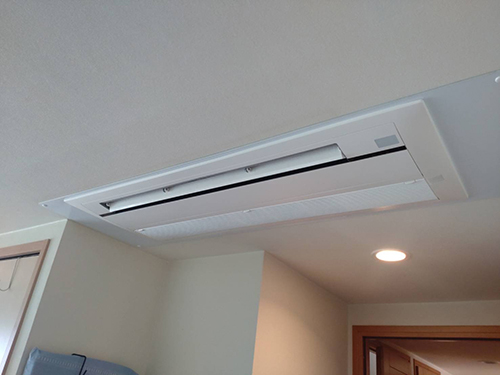 元々天井埋込型がお部屋の左寄りに取り付けされており、見た目が悪くお客様が気にされていました。既存のエアコンを工事した職人の判断でそうなっていたようですが、エアコンランドの経験豊富な職人によって問題なくお部屋の中心への取り付けが実現できました。見た目だけでなくお部屋全体に満遍なく風を届けられるようになり、お客様にも大変ご満足いただきました。