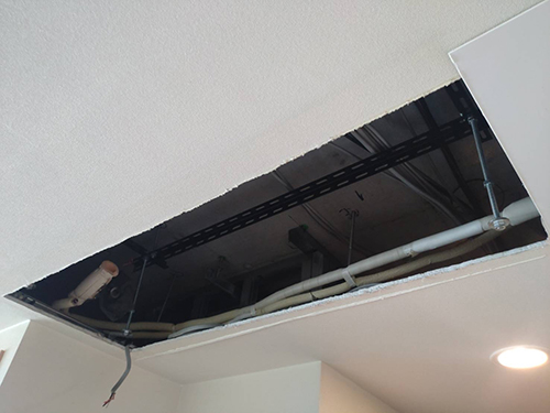 次に天井埋込形を設置するために天井に穴を空けて行きます。場合によっては、天井が落ちてきてしまったりと大事故になりかねません。事前の調査と丁寧な作業で確実に進めていきます。