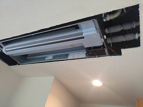 ハウジングエアコン1台とルームエアコン1台の同時入替え実例です。天井埋込形エアコンが壊れてしまったので入替えをしたいとのご相談です。ついでに隣の部屋のルームエアコンも一緒に入替えることになりました。お客様はホームページと口コミをご覧になり、専門店なので難しい工事も安心だろうとお考えになりご依頼いただきました。