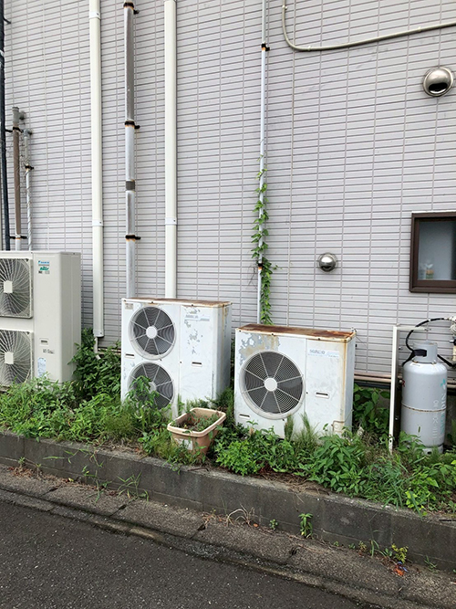 既存室外機も取り外します。室外機側の設備も再利用します。既存設備を加工し、再利用して新規室外機を接続します。既存配管をテープ巻きにて修繕して、室外機に接続しました。