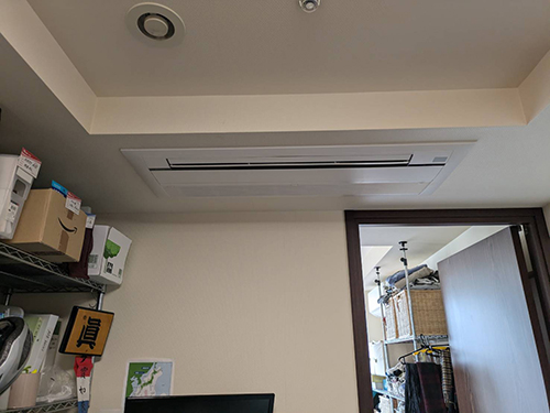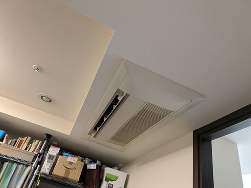 天井埋込カセット形ハウジングエアコンの入替え実例です。お客様は冷房が効かないので修理依頼をしたら、古くて部品が無く修理不可と言われたそうです。アフルエントに折り込まれたチラシをご覧になりエアコンランドにご連絡いただきました。同じマンションの別部屋にて施工実績があったことが決め手となり、入替えのご依頼をいただきました。