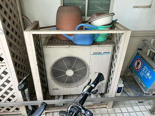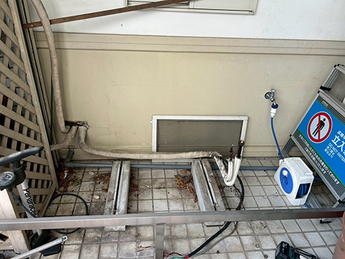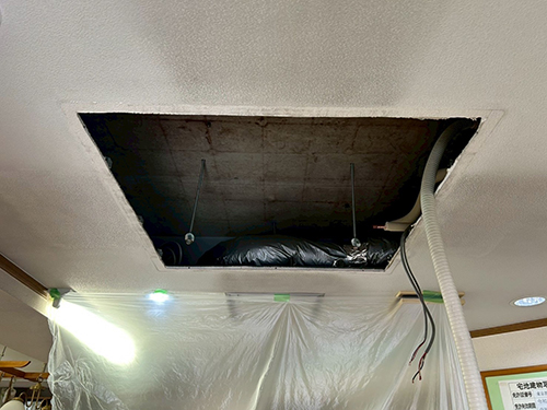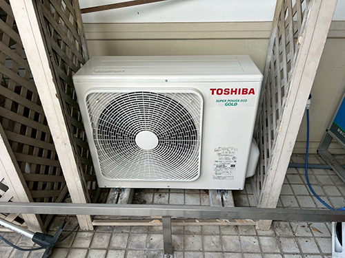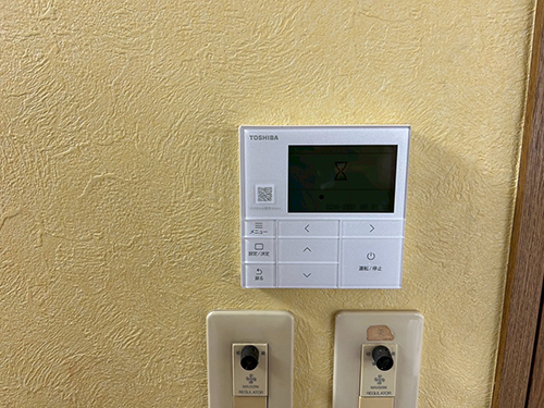 既存機器は三菱重工製の天井カセット形エアコンです。お客様のご希望により、三菱重工製から東芝製のエアコンへ入替えることになりました。室外機は1階地面置きです。リモコンは壁付けのワイヤードリモコンです。