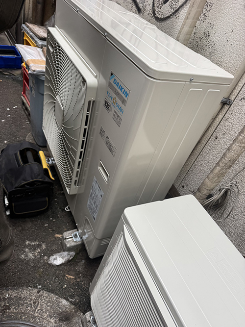 室外機は1階に設置してあります。飲食街のため通行人が多いですが、細心の注意を払いながら搬出入いたします。2人作業で息を合わせながら慎重に作業いたします。