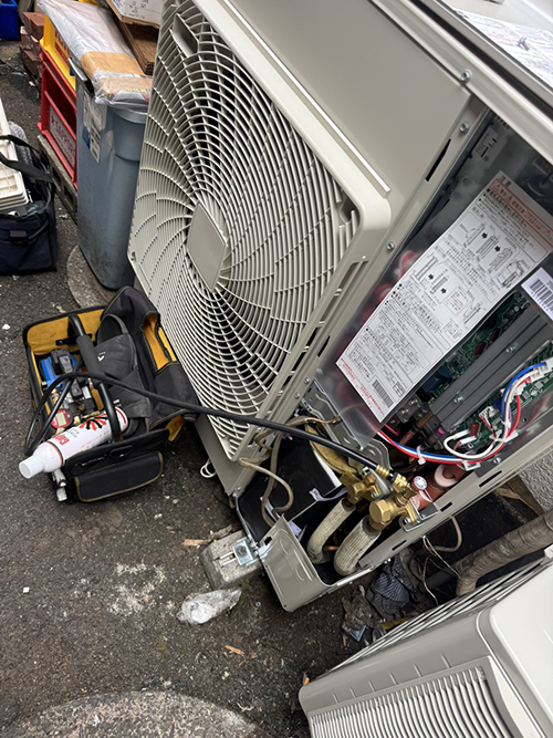 ポンプダウンをして既存室外機に冷媒ガスを戻し、既存室内、室外機を取り外し撤去しました。室内機を降ろす時は2人作業で行います。