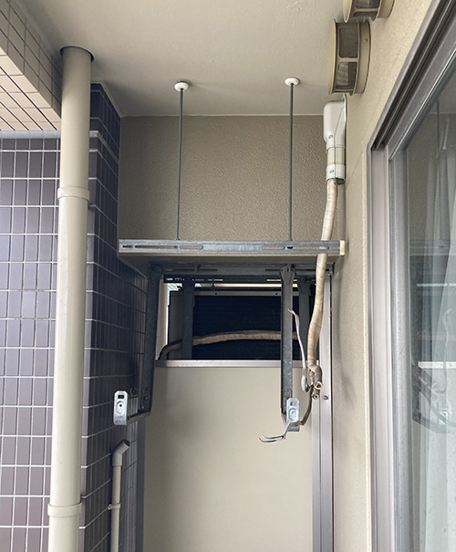 既設機器はダイキン製です。同じダイキン製で入替えます。室外機は壁に金具で取り付けてありました。後継機種の室外機サイズが大きくなるため、同じ位置に取り付けることは難しそうです。お客様にご説明し、室外機の場所を変更して入替えます。