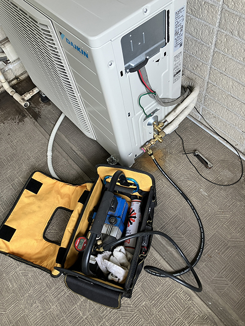 真空引き作業になります。真空引きをしないと機器の寿命が短くなったり故障の原因になります。エアコンランドでは確実に真空引きを実施しておりますのでご安心ください。