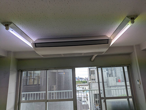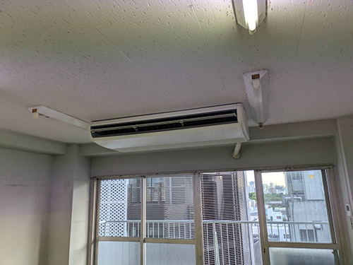 天吊り1方向タイプの入替え実例です。既存顧客の不動産管理会社からのご依頼です。既存エアコンの耐用年数が経過したため、リフォームに伴い入替えをご検討されていました。