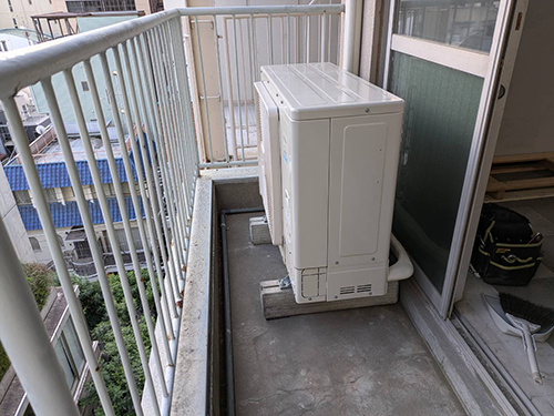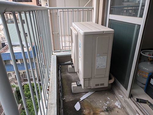 室外機はベランダに設置してあります。少々狭いですが、吹き出す風を遮らない柵になっており、設置環境は良好です。現場によっては設置環境の問題で冷房が効かないというケースもございます。