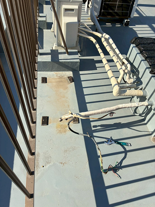 室外機は3階建てビルの屋上に設置してあります。機器の搬出入は階段を使うことになりました。2人作業で階段で息を合わせながら回りに当てないように慎重に作業いたします。
