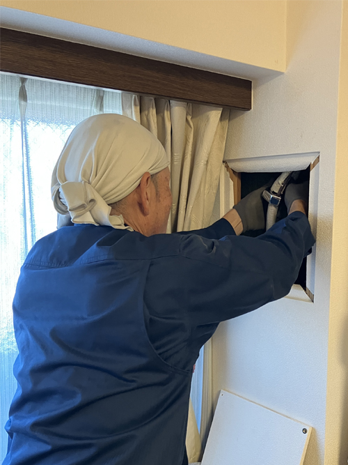 隠蔽配管再利用の工事で点検口内で配管等を接続する必要がある技術力の必要な工事でした。子供部屋にはありましたが洋室側に点検口がなかったため、子供部屋の点検口から洋室側の作業を行い、新しい点検口を設けずに対応いたしました。難工事現場もエアコンランドの経験豊富な熟練のスタッフにおまかせください。現場確認から施工までお客様に寄り添ったプランをご提供します。