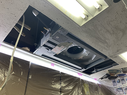 新規室内機を取り付けます。慎重に本体を天井懐に納めます。パネルを取り付けて室内側は完了です。