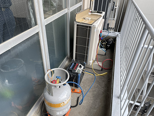 機器に残る冷媒ガスを回収していきます。フロン排出抑制法で定められた方法で確実に冷媒ガスを回収します。エアコンランドでは定められた施工方法を遵守した作業を徹底しておりますのでご安心ください。