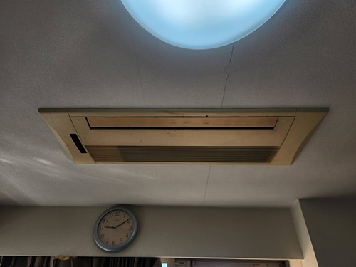 既設機は東芝製の天井埋込形です。東芝製からダイキン製へ入替えます。内部を確認したところカビが発生しており、効きを悪くしている要因のひとつと思われます。現地調査にて性能や保証に関してご説明し、ご契約いただけました。