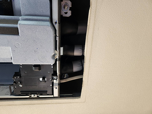 既存室内機を撤去し冷媒配管・ドレン配管の盛り替え工事となります。断熱処理もしっかり行いました。パネルをはめ込み、室内側の作業は完了です。
