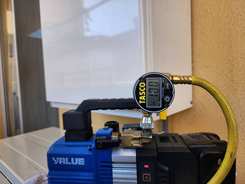 真空引き作業になります。真空引きをしないと機器の寿命が短くなったり故障の原因になります。エアコンランドでは確実に真空引きを実施しておりますのでご安心ください。