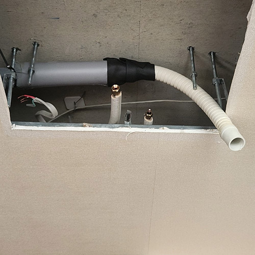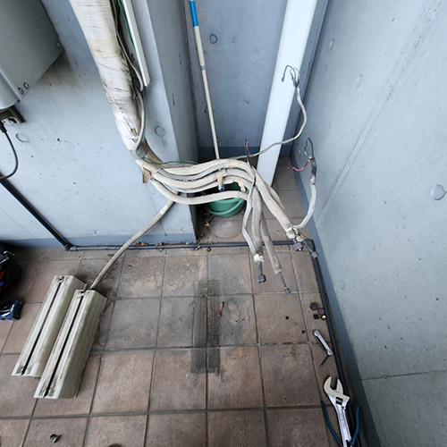 室外機を取り外しました。こちらも配管など再利用するために加工します。冷媒配管、ドレン配管を加工して、室内機吊り込み準備完了です。