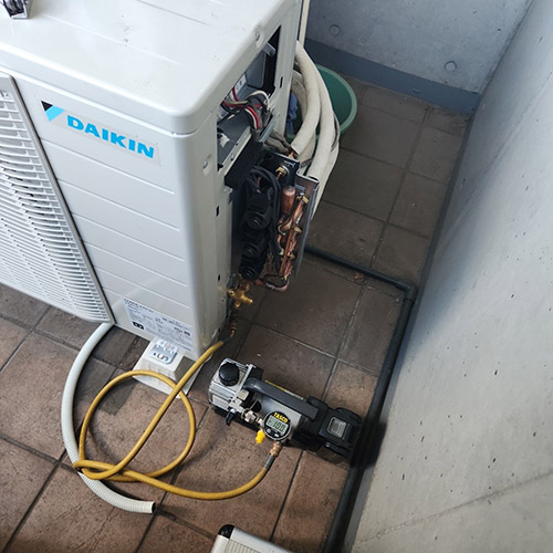 真空引き作業になります。真空引きを行わないと機器の寿命が短くなったり故障の原因になります。エアコンランドでは確実に真空引きを実施しておりますのでご安心ください。