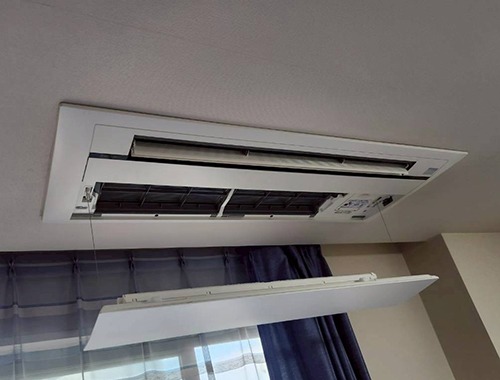 今回は天井埋込カセット形シングルフローエアコンの入替え実例です。10年使用したエアコンの効きがだんだん悪くなってきているので、入替えの検討をされているお客様です。マンションの管理人様より、実績豊富なエアコンランドでのご購入をお勧めいただき、お問い合わせいただきました。決め手は、担当営業が現地確認時に施工に関して親切に分かりやすく細かく提案してくれたためとの事です。