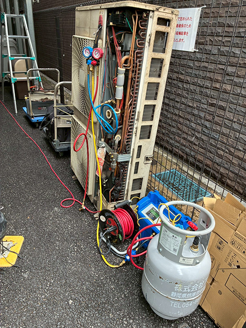ポンプダウンをして、既存室内、室外機を取り外し撤去しました。室内機を下す時は2人作業で行います。