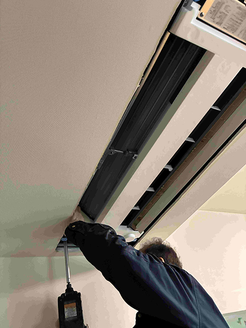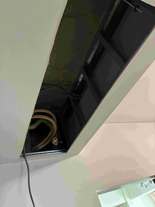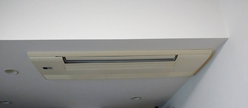 天井埋込カセット形シングルフローエアコンの入替え実例です。既存エアコンの長期使用による経年劣化と、パネルの黄ばみが目立ったため入替えの検討をされているお客様です。既存機器三菱電機から新機器三菱電機へ同メーカーでの入替え工事となります。